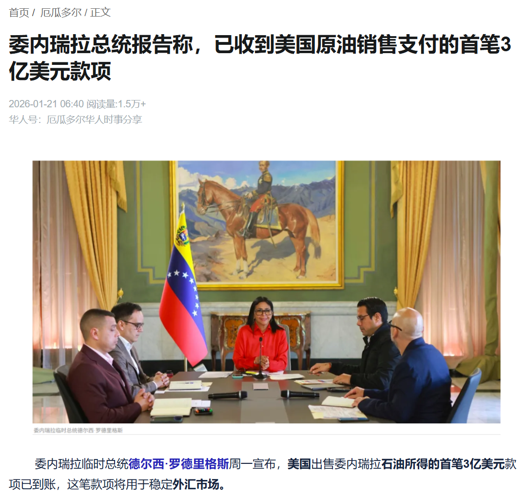 当地时间2026年1月20日,委内瑞拉代总统德尔西·罗德里格斯亲自出来“报喜”了。她说,政府已经收到了首笔原油销售款,总额是3亿美元。而这笔钱,正是源于那个由美国主导、总价5亿美元的石油出口协议。
