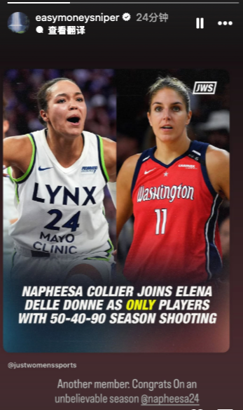 本场比赛,山猫球员科利尔10投8中,三分球4投3中,极其高效地砍下19分4篮板2助攻2抢断。本场比赛过后,科利尔本赛季的投篮命中率为53.1%、三分命中率40.3%、罚球命中率90.6%,她也就此成为WNBA历史上第二位单赛季打出了50%+40%+90%命中率的球员,此前仅有德尔·多恩做到过。